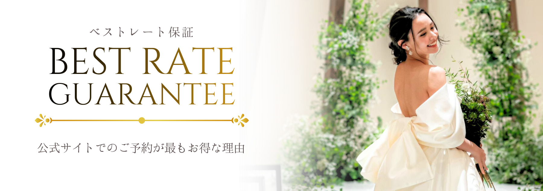 結婚式の実施費用において 公式HPからのご予約・ご成約をいただいたお客様に対し、最安値のプランをお約束させていただきます。