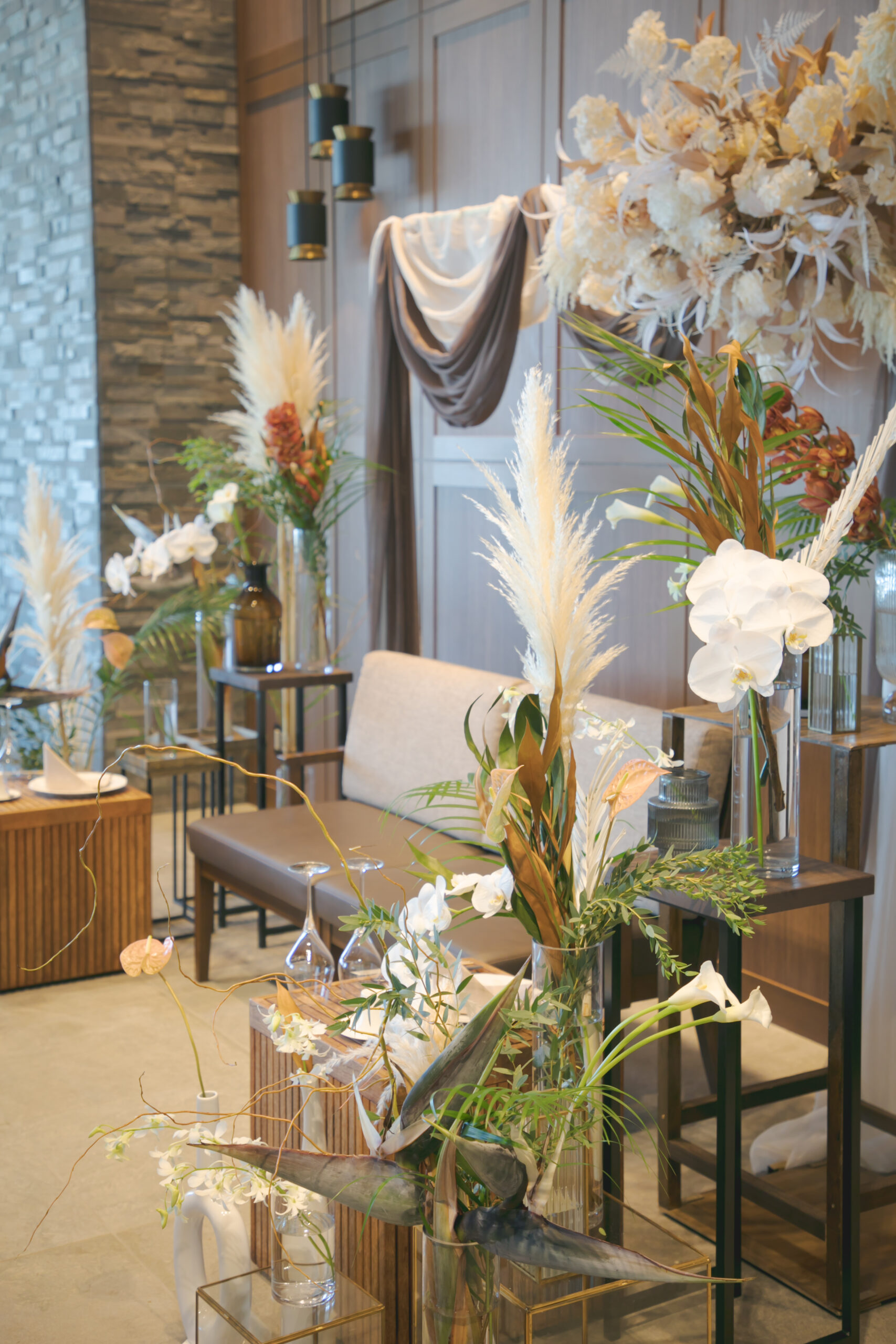 ソファ席に合わせたテーブル装花もペーパーアイテムと