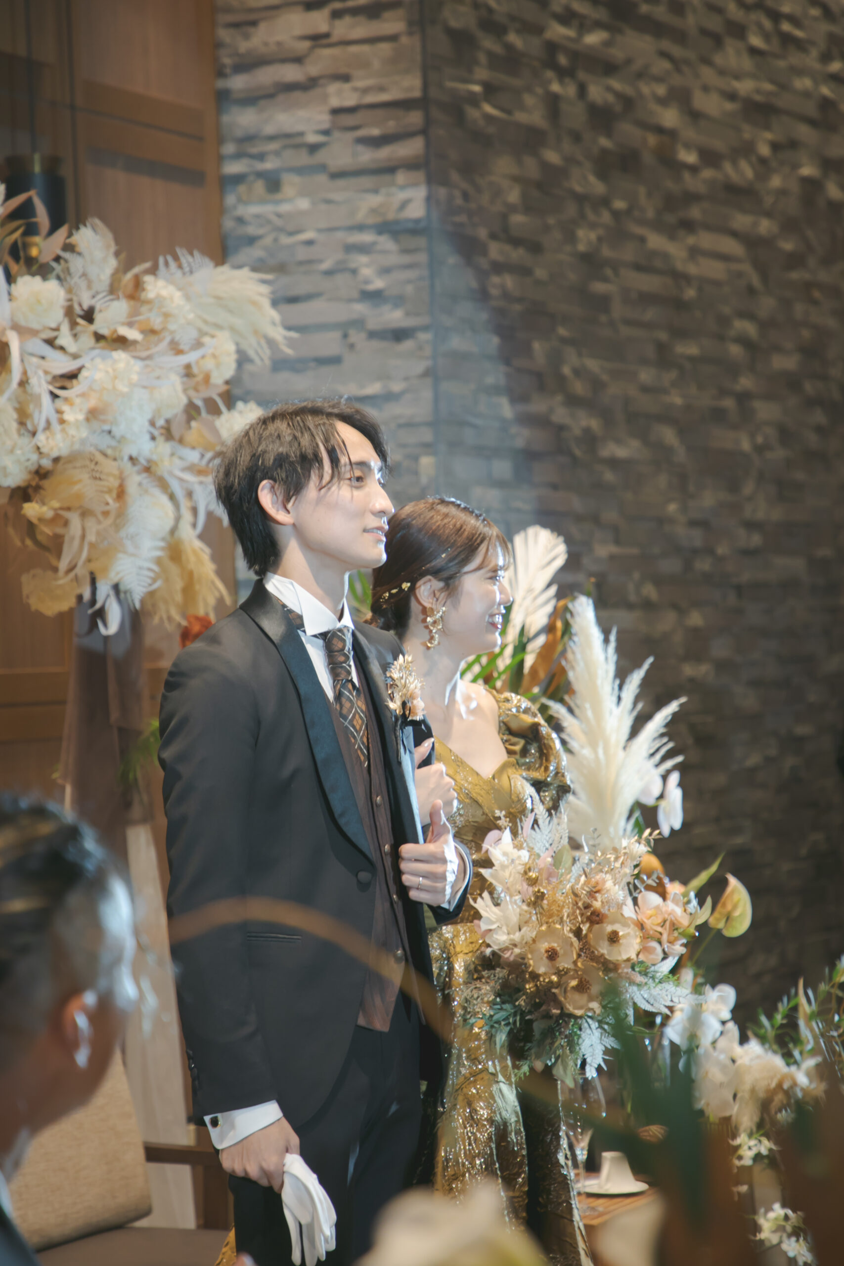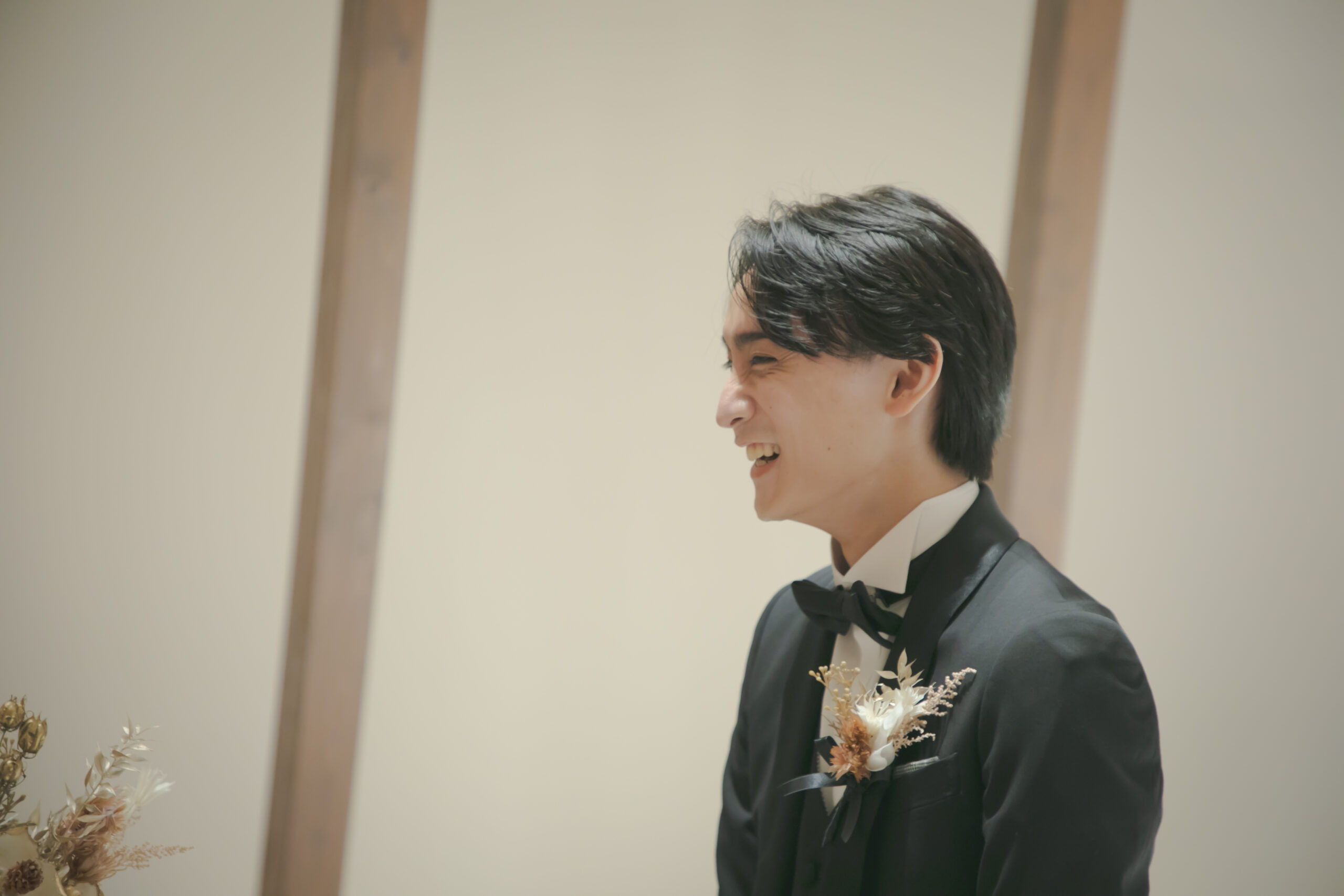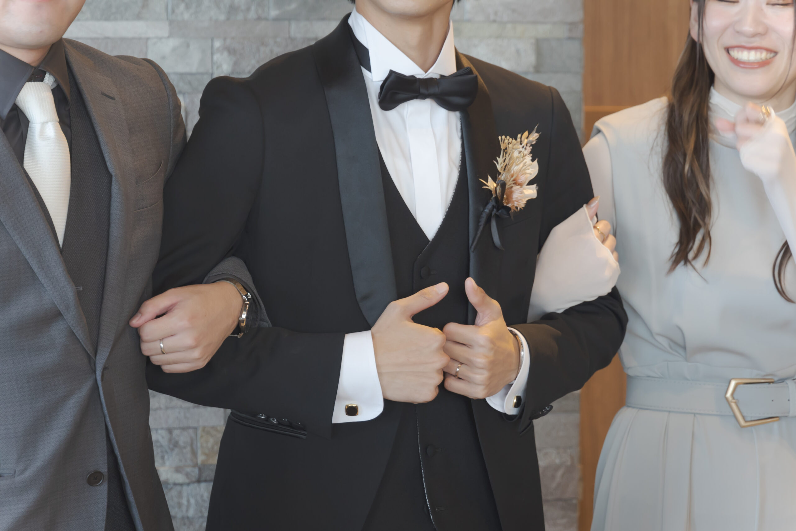 新郎様はブラックタキシードにブラウンのベストと
