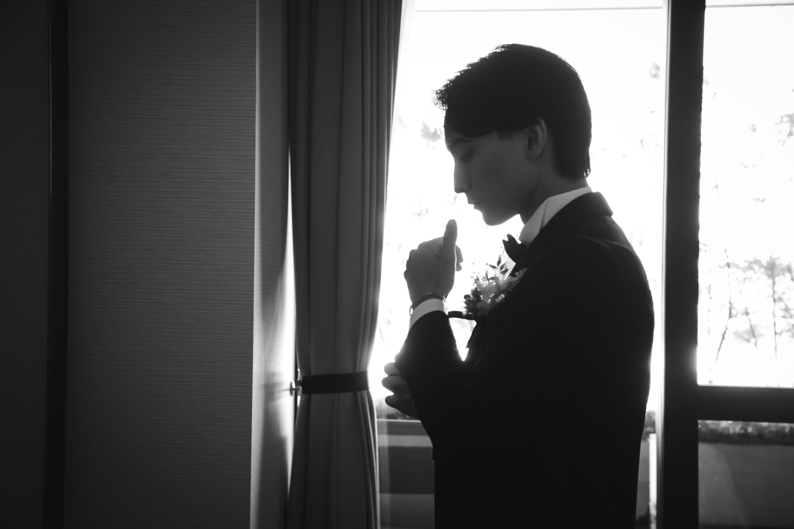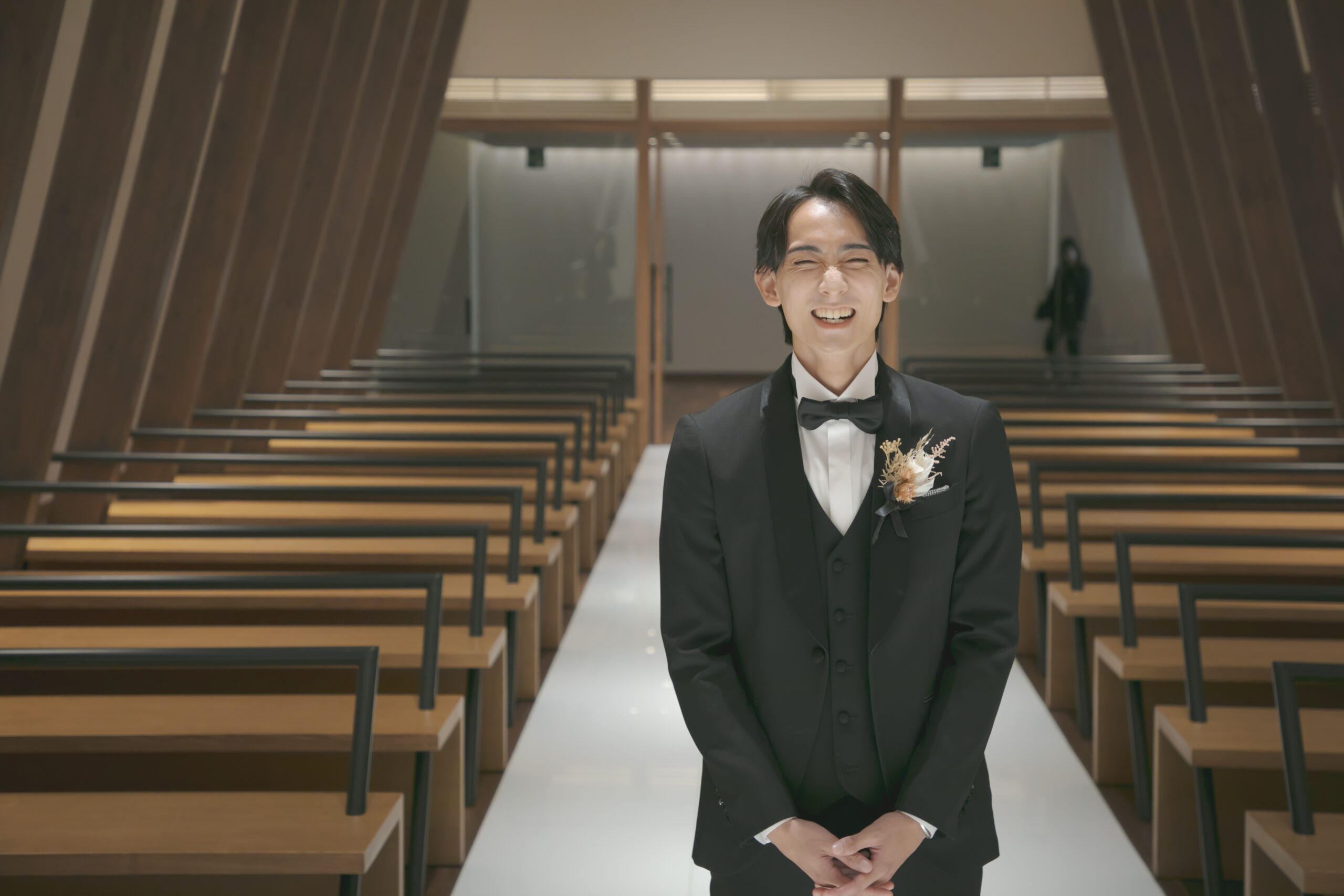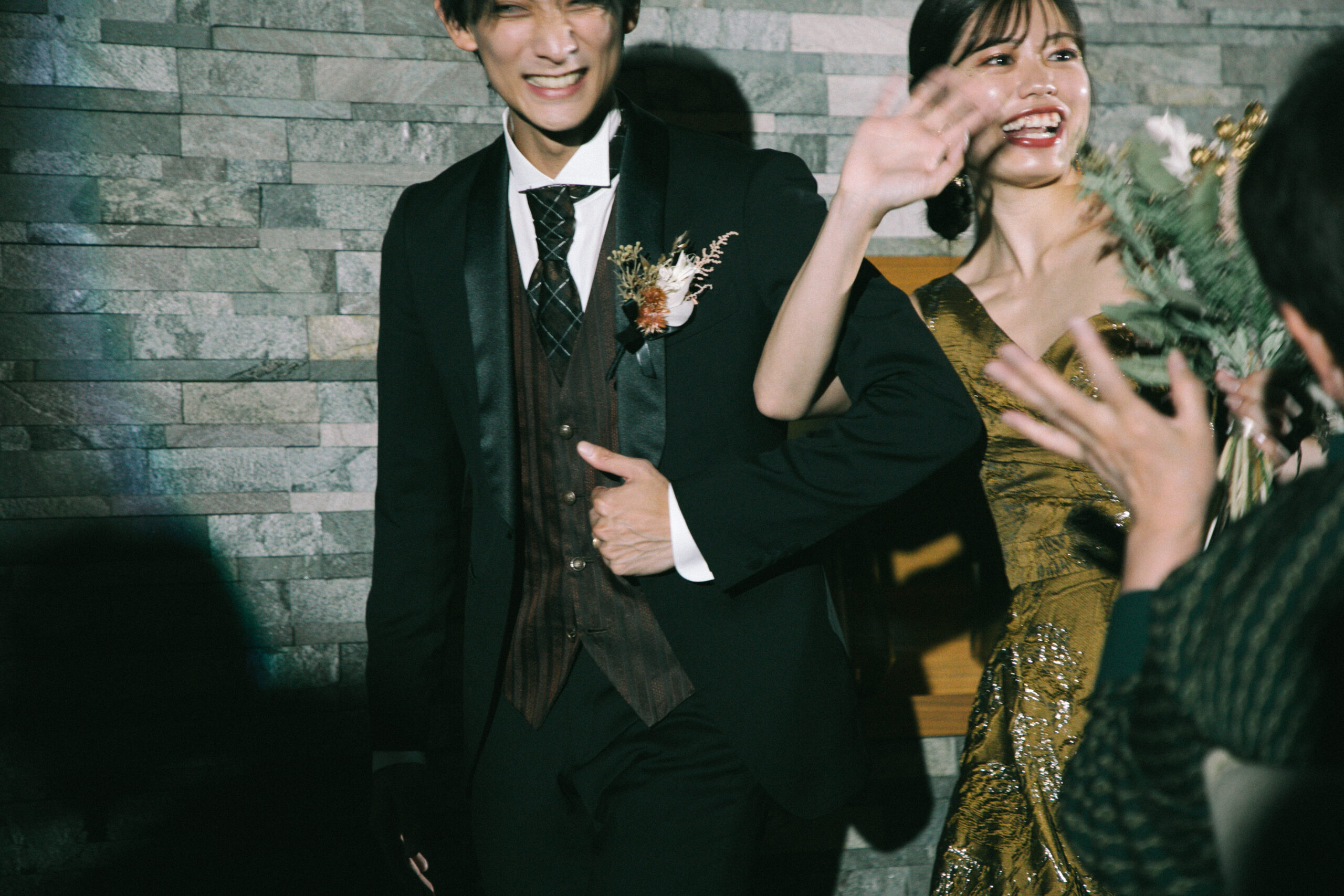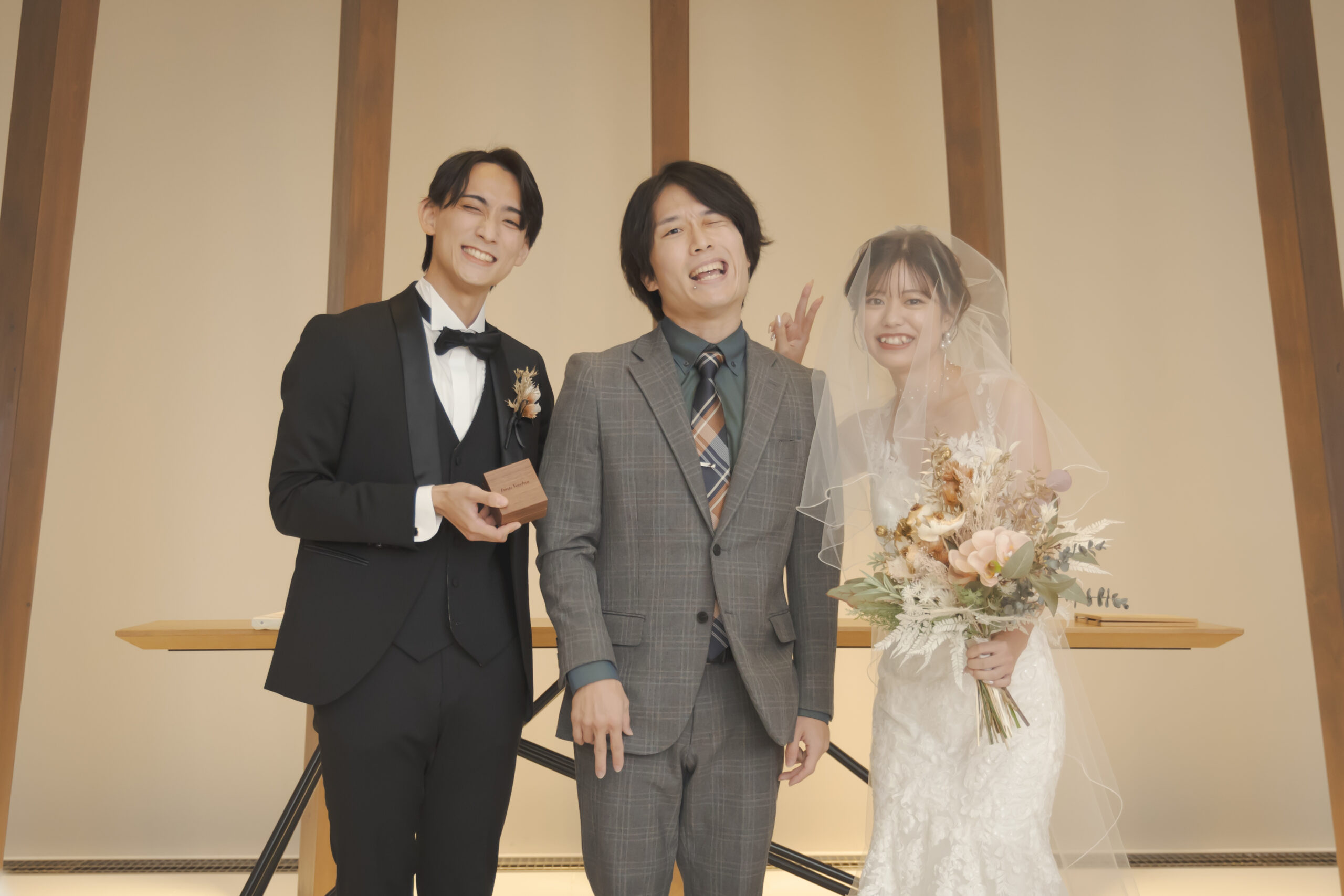新郎様はブラックタキシードにブラウンのベストと