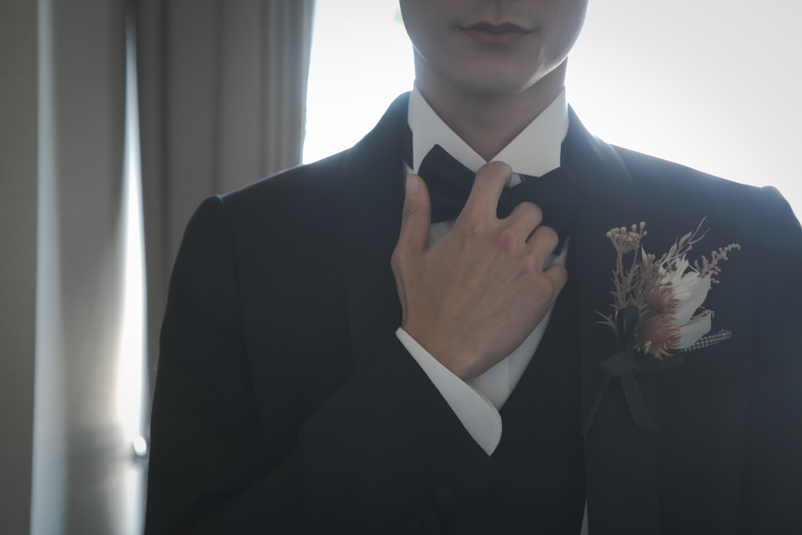 高級感のある洗練されたブラックのタキシードと蝶ネクタイ