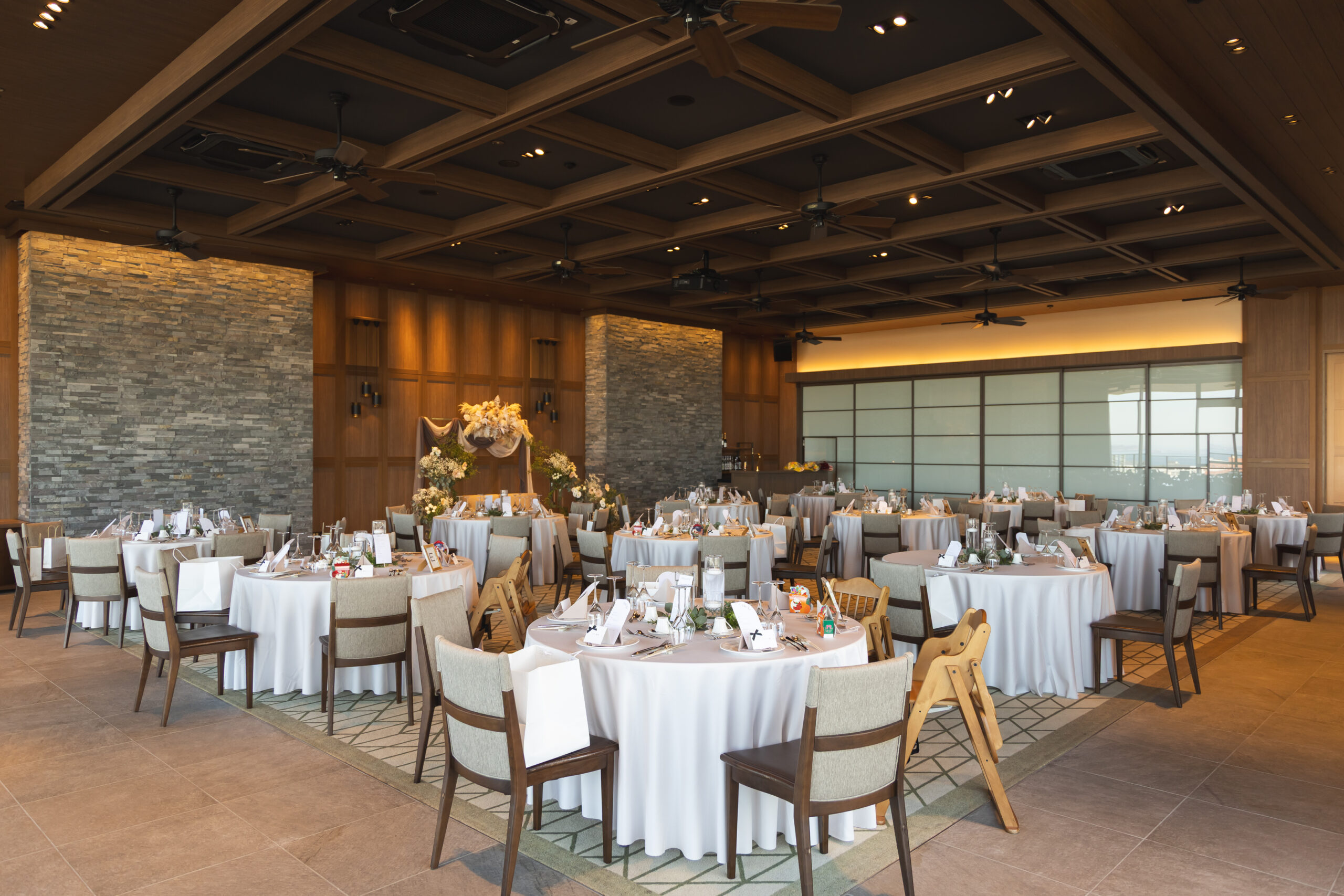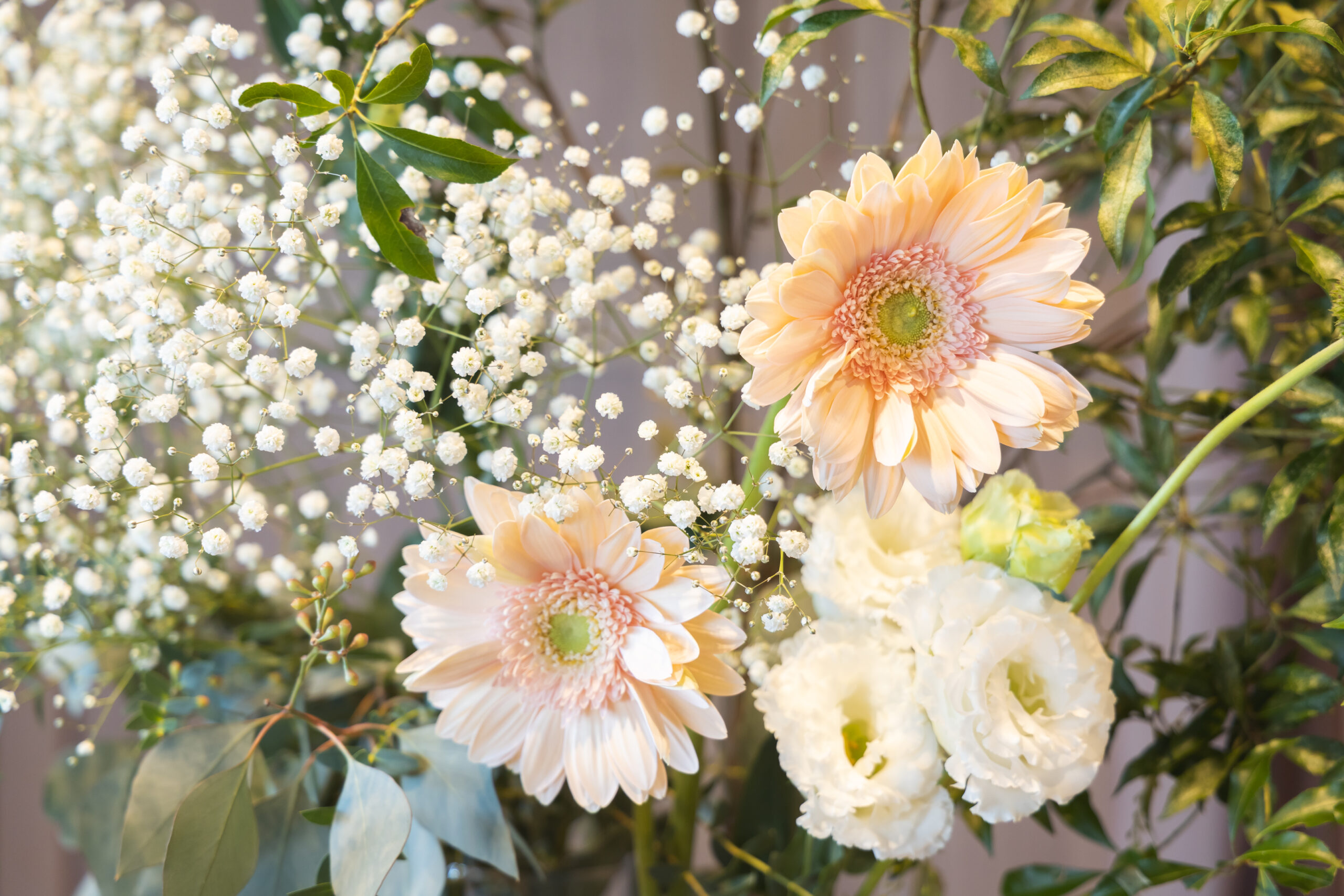 会場はホワイトやベージュを基調としたお花を使用し 温かみのある空間を演出しました