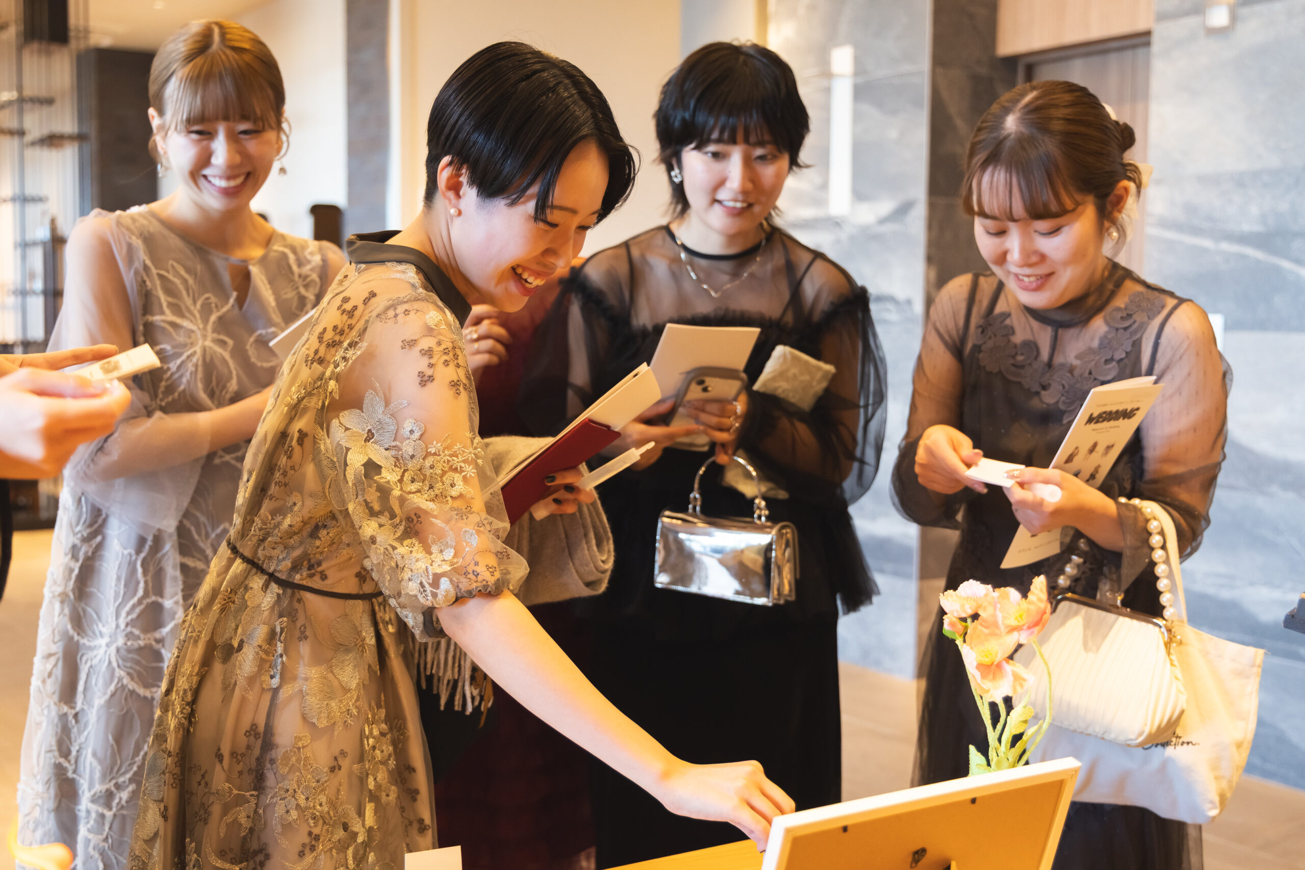 お二人がご用意されていた「BGM当てクイズ」や ゲスト様参加型の「フラワーボックス」の結婚証明書を楽しむゲスト様のお姿がありました