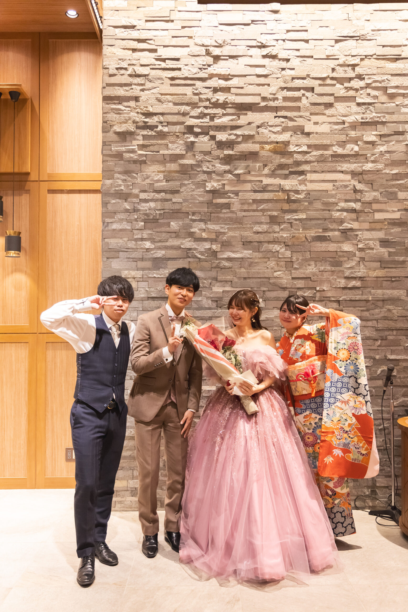 ご新郎様のベストとご新婦様のドレスはどちらもピンクで揃えました